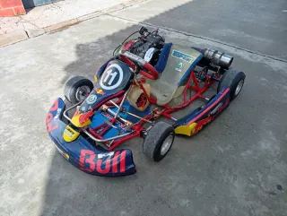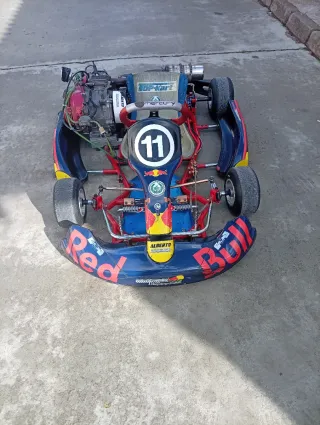Kart de competición infantil con diseño Red Bull. - Chasis de competición. - Número 11 visible. - Neumáticos de goma. - Volante deportivo.