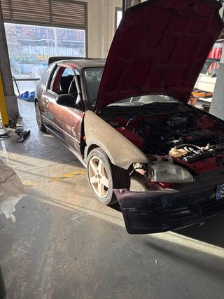 Honda civic eg 1995 El coche está sin itv ni seguro, falta homologar motor y frenada. Suspensiones, lip, piña, volante, jaula de 4 puntos y caídas homologadas. Especificaciones: - Motor: K20A2 - Escape hecho a medida homologable. - Centralita Doctronic reprogramable - Dirección asistida Citroën saxo falta instalación eléctrica - Radiador pequeño pero más ancho para posible instalación de AAC - Jaula antivuelco de 4 puntos SasakWorks - Suspensión BC Racing regulable en altura dureza y compresión del muelle - Latiguillos metálicos en frenada - Cambio de tambor a disco en frenada trasera - Cambio de frenada de 242 a 282 en frenada delantera, bomba de freno 1" y repartidor de frenada de MB6 - Reguladores de caída Hardrace delanteros y traseros - Shifter de aluminio con cableado - Llantas Japan Racing JR3 en 15" - Brakestopper Hardrace - Tengo casi todo de serie a excepción del motor, escape y cableado - Faltan cosas por hacer -Actualmente no tiene lip y tiene montados los faros de serie Precio algo negociable muchísimo dinero y tiempo invertido.