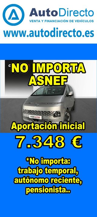 ¿No consigues financiación? ¡Tenemos la solución! RENT CREDIT (Alquiler con opción a compra) *************************************************************************** ✅ Aprobamos más del 95% de las operaciones. ✅ No importa ASNEF o RAI, impagos pendientes, ser autónomo o empresa reciente, ser pensionista. \\n ✅ Imprescindible aportación inicial del 20%. ✅ Ejemplo de operación: HYUNDAI STARIA 2.2 CRDI 177CV 9S 8AT TECNO. Ref. W953174MJC - Precio vehículo: 36740 €. - Aportación inicial de 7348 €. - Cuota mes desde 759 €. ✅ Impuesto de circulación y garantía de 1 año incluidos. *************************************************************************** ✅ Más de 3.000 VEHÍCULOS EN STOCK. ✅ Kilómetros certificados. ✅ 17 concesionarios repartidos en toda España. ♻️ Aceptamos tu coche como parte de la operación. *************************************************************************** IMPORTANTE: -. Este anuncio, no es vinculante, puede contener errores. SE MUESTRAN A TÍTULO INFORMATIVO Y NO CONTRACTUAL. -. Consultar disponibilidad del vehículo y datos exactos: fecha de matriculación, importes, etc,... *************************************************************************** Te ofrecemos distintas opciones: Venta al contado, financiación, renting, RENT CREDIT (Alquiler con opción a compra).