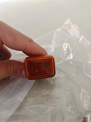 Intermitente lateral de color naranja. Su diseño es compacto y llamativo. - Color: Naranja. - Forma: Rectangular. - Material: Plástico.