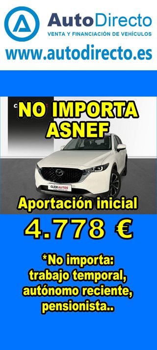 ¿No consigues financiación? ¡Tenemos la solución! RENT CREDIT (Alquiler con opción a compra) *************************************************************************** ✅ Aprobamos más del 95% de las operaciones. ✅ No importa ASNEF o RAI, impagos pendientes, ser autónomo o empresa reciente, ser pensionista. \\n ✅ Imprescindible aportación inicial del 20%. ✅ Ejemplo de operación: MAZDA CX-5 2.0 SKYACTIV 165CV ZENITH + PACK BOSE. Ref. W959545MDM - Precio vehículo: 27440 €. - Aportación inicial de 5488 €. - Cuota mes desde 569 €. ✅ Impuesto de circulación y garantía de 1 año incluidos. *************************************************************************** ✅ Más de 3.000 VEHÍCULOS EN STOCK. ✅ Kilómetros certificados. ✅ 17 concesionarios repartidos en toda España. ♻️ Aceptamos tu coche como parte de la operación. *************************************************************************** IMPORTANTE: -. Este anuncio, no es vinculante, puede contener errores. SE MUESTRAN A TÍTULO INFORMATIVO Y NO CONTRACTUAL. -. Consultar disponibilidad del vehículo y datos exactos: fecha de matriculación, importes, etc,... *************************************************************************** Te ofrecemos distintas opciones: Venta al contado, financiación, renting, RENT CREDIT (Alquiler con opción a compra).