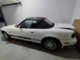 Mazda mx5 na preserie del 90 en perfecto estado, 1.6 115cv. no tiene elevLunas eléctrico ni aire acondicionado, lo único que tiene es dirección asistida. Capota perfecta, diferencial autoblocante, frenada de nb, llantas Japan Racing con neumáticos nankang al 80%, interior muy bien, pintado hace dos años. Tengo todo lo de serie. NO CAMBIO POR NADA. El precio se podría rebajar algo quitando extras como autoblocante o llantas. Porfavor no perdamos el tiempo en tonterías.