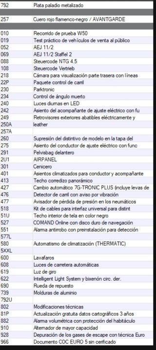Equipamiento serie: - [807] Mantenimiento del modelo con Código - [901] Paquete interior cromado - [493] Paquete portaobjetos - [U60] Capó activo - [5U4] Rejilla paragolpes efecto-diamante - [F69] Retrovisor exterior regulable eléctricamente y calefactable, ambos - [632] Faro LED High Performance - [TTW] Encendido automático de luces - [8SK] Pilotos traseros LED - [K11] adaptables Luz de freno - [CE1] Limpiaparabrisas con Sensor de lluvia - [AKN] Lunas atérmicas - [EJ8] Sistema de audio Audio 20 (con pantalla en color) - [350] Mercedes-Benz Sistema de llamada de socorro - [367] Asistente a la conducción: Sistema información del tráfico Live Tráfico - [9WT] Configurar el vehículo (Servicio online / Apps) - [362] Módulo de comunicación (LTE) Preinstalación Mercedes me connect - [245] Ordenador de viaje - [513] Asistente a la conducción: Asistente-limitación de velocidad - [06U] sistema de información Mercedes me connect - [475] Sistema control presión neumáticos - [739] Acabado interior: Piezas decoración Aluminio - [294] Airbag de rodilla lado del conductor - [AYC] Airbag conductor/acompañante - [291] airbag para cadera delante (Pelvisbag) - [AYC] Sistema de airbag para la cabeza (Airbag de la ventana) - [AYC] Airbag lateral (Sidebag) delante - [C99] Airbag acompañante Desconectable - [570] Reposabrazos delante con Compartimento - [U12] Alfombras velours - [DRE07] Climatizador automático (Thermatic 2-zonas) - [737] Acabado interior: Madera noble fresno, Negro / Aluminio - [AH5] Asiento delante izquierda regulable eléctricamente - [222] Asiento delante derecha regulable eléctricamente - [3NZ] Respaldo del asiento trasero dividido / plegable - [] Elevalunas eléctric. con Protección de aplastamiento - [DVB04] Cierre centralizado con Mando a distancia - [4E2] Desbloqueo a distancia Tapa trasera - [U01] Dispositivo de alarma / Indicativo del estado para Cinturones de seguridad atrás - [09U] Monitorización del vehículo (sistema para localizar el vehículo) - [7AA] Inmoviliz