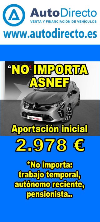 ¿No consigues financiación? ¡Tenemos la solución! RENT CREDIT (Alquiler con opción a compra) *************************************************************************** ✅ Aprobamos más del 95% de las operaciones. ✅ No importa ASNEF o RAI, impagos pendientes, ser autónomo o empresa reciente, ser pensionista. \\n ✅ Imprescindible aportación inicial del 20%. ✅ Ejemplo de operación: MITSUBISHI COLT 100T 1.0 90CV KAITEKI. Ref. W952727MSK - Precio vehículo: 14890 €. - Aportación inicial de 2978 €. - Cuota mes desde 313 €. ✅ Impuesto de circulación y garantía de 1 año incluidos. *************************************************************************** ✅ Más de 3.000 VEHÍCULOS EN STOCK. ✅ Kilómetros certificados. ✅ 17 concesionarios repartidos en toda España. ♻️ Aceptamos tu coche como parte de la operación. *************************************************************************** IMPORTANTE: -. Este anuncio, no es vinculante, puede contener errores. SE MUESTRAN A TÍTULO INFORMATIVO Y NO CONTRACTUAL. -. Consultar disponibilidad del vehículo y datos exactos: fecha de matriculación, importes, etc,... *************************************************************************** Te ofrecemos distintas opciones: Venta al contado, financiación, renting, RENT CREDIT (Alquiler con opción a compra).