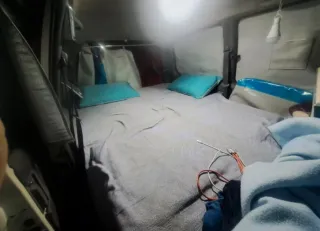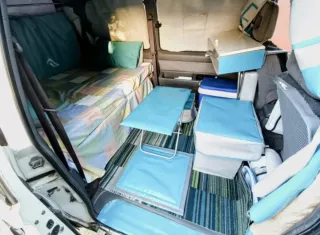 Perfectas condiciones de motor, LISTA PARA IR DE ACAMPADA. Pagas de seguro 130 euro al tener más de 25 años. funciona el aire acondicionado, calefacción, ventanillas, las ruedas están al 60%, esta tal como en las fotos, se hace cama entera, sale madera de abajo cama y se une parte del puff gris baul, tiene mueble suspendido para guardar cosas, puff gris con baul abajo para capacidad de guardar cosas, tiene 1 asiento puff bajo, ventanas con cortinas y parasol pegado, cortinas separadora, cortina trasera... mejor preguntar. Es mixta y se entrega con todos sus asientos,habitación trasera a medida, 6 plazas.