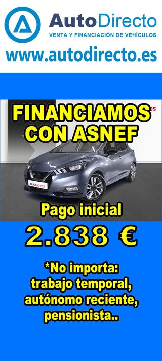 ¿No consigues financiación? ¡Tenemos la solución! *************************************************************************** RENT CREDIT: Aprobamos más del 90% de las operaciones. No importa ASNEF o RAI, impagos pendientes, ser autónomo o empresa reciente, ser pensionista. Imprescindible pago inicial del 20%. Ejemplo de operación: NISSAN MICRA 1.0 IG-T 92CV ACENTA. Ref. W950834LZP - Precio vehículo financiado: 13140 €. - Pago inicial de 2628 €. - Cuota mes desde 278 €. - Impuesto de circulación y garantía (mínimo 1 año) incluidos. *************************************************************************** ✅ Más de 3.000 COCHES Y FURGONETAS EN STOCK. ✅ HASTA 2 AÑOS DE GARANTIA. ✅ Kilómetros certificados. ✅ 17 concesionarios repartidos en toda España. ♻️ Aceptamos tu coche como parte del pago. *************************************************************************** IMPORTANTE: -. Este anuncio, no es vinculante, puede contener errores. SE MUESTRAN A TÍTULO INFORMATIVO Y NO CONTRACTUAL. -. Consultar disponibilidad del vehículo y datos exactos: fecha de matriculación, importes, etc,... *************************************************************************** Te ofrecemos distintas opciones: financiación, renting, alquiler con opción a compra, rent credit. En nuestro stock disponible encontraras: 3008 , qashqai , corolla , rav4 , sandero , Duster , yaris , 2008 , Tucson , Ibiza , 208 , Sportage , a3 , c4 , Formentor , q3 , yaris cross , 500 , c3 , arona , zs , x1 , kona , corsa , clase a , león , 308 , serie 1 , golf , focus , captur , a1 , tiguan , i20 , t roc , stonic , xc40 , civic , q5 , serie 3 , glb , 5008 , ateca , clio , kuga , c hr , i30 , arkana , juke , a4 , x3 , cx 5 , xc60 , kamiq , taigo , Mustang , x6 , polo , ceed , karoq , x2 , Astra , niro , cx 30 , a5 , cooper , megane , moka , fiesta , hs , q2 , clase c , serie 3 , renegade , picanto.