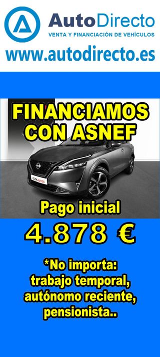 ¿No consigues financiación? ¡Tenemos la solución! *************************************************************************** RENT CREDIT: Aprobamos más del 90% de las operaciones. No importa ASNEF o RAI, impagos pendientes, ser autónomo o empresa reciente, ser pensionista. Imprescindible pago inicial del 20%. Ejemplo de operación: NISSAN QASHQAI 1.3 DIGT 160CV MHEV N-CONNECTA SKYLINE PACK XTRONIC. Ref. W959125MPW - Precio vehículo financiado: 29290 €. - Pago inicial de 5858 €. - Cuota mes desde 607 €. - Impuesto de circulación y garantía (mínimo 1 año) incluidos. *************************************************************************** ✅ Más de 3.000 COCHES Y FURGONETAS EN STOCK. ✅ HASTA 2 AÑOS DE GARANTIA. ✅ Kilómetros certificados. ✅ 17 concesionarios repartidos en toda España. ♻️ Aceptamos tu coche como parte del pago. *************************************************************************** IMPORTANTE: -. Este anuncio, no es vinculante, puede contener errores. SE MUESTRAN A TÍTULO INFORMATIVO Y NO CONTRACTUAL. -. Consultar disponibilidad del vehículo y datos exactos: fecha de matriculación, importes, etc,... *************************************************************************** Te ofrecemos distintas opciones: financiación, renting, alquiler con opción a compra, rent credit. En nuestro stock disponible encontraras: 3008 , qashqai , corolla , rav4 , sandero , Duster , yaris , 2008 , Tucson , Ibiza , 208 , Sportage , a3 , c4 , Formentor , q3 , yaris cross , 500 , c3 , arona , zs , x1 , kona , corsa , clase a , león , 308 , serie 1 , golf , focus , captur , a1 , tiguan , i20 , t roc , stonic , xc40 , civic , q5 , serie 3 , glb , 5008 , ateca , clio , kuga , c hr , i30 , arkana , juke , a4 , x3 , cx 5 , xc60 , kamiq , taigo , Mustang , x6 , polo , ceed , karoq , x2 , Astra , niro , cx 30 , a5 , cooper , megane , moka , fiesta , hs , q2 , clase c , serie 3 , renegade , picanto.