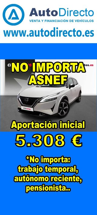 ¿No consigues financiación? ¡Tenemos la solución! RENT CREDIT (Alquiler con opción a compra) *************************************************************************** ✅ Aprobamos más del 95% de las operaciones. ✅ No importa ASNEF o RAI, impagos pendientes, ser autónomo o empresa reciente, ser pensionista. ✅ Imprescindible aportación inicial del 20%. ✅ Ejemplo de operación: NISSAN QASHQAI 1.3 DIGT 140CV MHEV N-CONNECTA. Ref. W954477MFC - Precio vehículo: 22640 €. - Aportación inicial de 4528 €. - Cuota mes desde 471 €. ✅ Impuesto de circulación y garantía de 1 año incluidos. *************************************************************************** ✅ Más de 3.000 VEHÍCULOS EN STOCK. ✅ Kilómetros certificados. ✅ 17 concesionarios repartidos en toda España. ♻️ Aceptamos tu coche como parte de la operación. *************************************************************************** IMPORTANTE: -. Este anuncio, no es vinculante, puede contener errores. SE MUESTRAN A TÍTULO INFORMATIVO Y NO CONTRACTUAL. -. Consultar disponibilidad del vehículo y datos exactos: fecha de matriculación, importes, etc,... *************************************************************************** Te ofrecemos distintas opciones: Venta al contado, financiación, renting, RENT CREDIT (Alquiler con opción a compra).