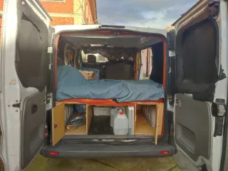 Se vende opel vivaro camperizada 9500€ sin homologar pasa itv sin desmontar sin problema . Esta aislada con kaiflex. Cama plegable con medidas de 180x150, nevera de 47l, grifo recargable y fregadero, oscurecedores para todos los cristales, batería y placa portátil