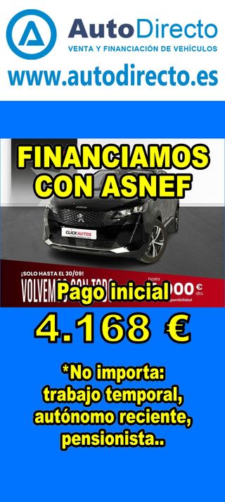 ¿No consigues financiación? ¡Tenemos la solución! *************************************************************************** RENT CREDIT: Aprobamos más del 90% de las operaciones. No importa ASNEF o RAI, impagos pendientes, ser autónomo o empresa reciente, ser pensionista. Imprescindible pago inicial del 20%. Ejemplo de operación: PEUGEOT 3008 1.5 BLUEHDI 130CV ALLURE EAT8. Ref. W955828LYN - Precio vehículo financiado: 22390 €. - Pago inicial de 4478 €. - Cuota mes desde 466 €. - Impuesto de circulación y garantía (mínimo 1 año) incluidos. *************************************************************************** ✅ Más de 3.000 COCHES Y FURGONETAS EN STOCK. ✅ HASTA 2 AÑOS DE GARANTIA. ✅ Kilómetros certificados. ✅ 17 concesionarios repartidos en toda España. ♻️ Aceptamos tu coche como parte del pago. *************************************************************************** IMPORTANTE: -. Este anuncio, no es vinculante, puede contener errores. SE MUESTRAN A TÍTULO INFORMATIVO Y NO CONTRACTUAL. -. Consultar disponibilidad del vehículo y datos exactos: fecha de matriculación, importes, etc,... *************************************************************************** Te ofrecemos distintas opciones: financiación, renting, alquiler con opción a compra, rent credit. En nuestro stock disponible encontraras: 3008 , qashqai , corolla , rav4 , sandero , Duster , yaris , 2008 , Tucson , Ibiza , 208 , Sportage , a3 , c4 , Formentor , q3 , yaris cross , 500 , c3 , arona , zs , x1 , kona , corsa , clase a , león , 308 , serie 1 , golf , focus , captur , a1 , tiguan , i20 , t roc , stonic , xc40 , civic , q5 , serie 3 , glb , 5008 , ateca , clio , kuga , c hr , i30 , arkana , juke , a4 , x3 , cx 5 , xc60 , kamiq , taigo , Mustang , x6 , polo , ceed , karoq , x2 , Astra , niro , cx 30 , a5 , cooper , megane , moka , fiesta , hs , q2 , clase c , serie 3 , renegade , picanto.