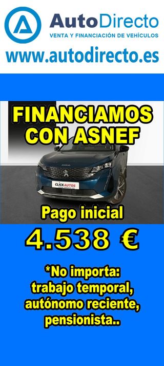 ¿No consigues financiación? ¡Tenemos la solución! *************************************************************************** RENT CREDIT: Aprobamos más del 90% de las operaciones. No importa ASNEF o RAI, impagos pendientes, ser autónomo o empresa reciente, ser pensionista. Imprescindible pago inicial del 20%. Ejemplo de operación: PEUGEOT 3008 1.5 BLUEHDI 130CV ALLURE. Ref. W954726LWW - Precio vehículo financiado: 21190 €. - Pago inicial de 4238 €. - Cuota mes desde 442 €. - Impuesto de circulación y garantía (mínimo 1 año) incluidos. *************************************************************************** ✅ Más de 3.000 COCHES Y FURGONETAS EN STOCK. ✅ HASTA 2 AÑOS DE GARANTIA. ✅ Kilómetros certificados. ✅ 17 concesionarios repartidos en toda España. ♻️ Aceptamos tu coche como parte del pago. *************************************************************************** IMPORTANTE: -. Este anuncio, no es vinculante, puede contener errores. SE MUESTRAN A TÍTULO INFORMATIVO Y NO CONTRACTUAL. -. Consultar disponibilidad del vehículo y datos exactos: fecha de matriculación, importes, etc,... *************************************************************************** Te ofrecemos distintas opciones: financiación, renting, alquiler con opción a compra, rent credit. En nuestro stock disponible encontraras: 3008 , qashqai , corolla , rav4 , sandero , Duster , yaris , 2008 , Tucson , Ibiza , 208 , Sportage , a3 , c4 , Formentor , q3 , yaris cross , 500 , c3 , arona , zs , x1 , kona , corsa , clase a , león , 308 , serie 1 , golf , focus , captur , a1 , tiguan , i20 , t roc , stonic , xc40 , civic , q5 , serie 3 , glb , 5008 , ateca , clio , kuga , c hr , i30 , arkana , juke , a4 , x3 , cx 5 , xc60 , kamiq , taigo , Mustang , x6 , polo , ceed , karoq , x2 , Astra , niro , cx 30 , a5 , cooper , megane , moka , fiesta , hs , q2 , clase c , serie 3 , renegade , picanto.