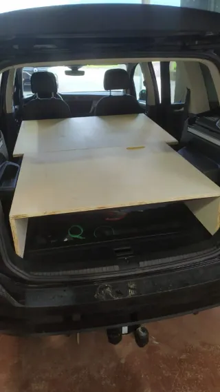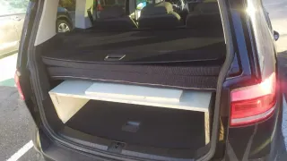 Camperizacion de madera con Colchón de 120 x 180, en tres módulos de 60 unidos y con cremallera para sacar la espuma, todo entra en el maletero sin q se vea y con el hueco para las maletas, acceso a la bandeja del fondo del maletero. Oscurecedores de todas las ventanas.