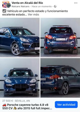 Porsche Cayenne S 4.8 V8 400cv – Año 2012 – Full Equip – Impecable Estado 📍 Ubicación: Matapozuelos (Valladolid) 📞 Contacto: 642 146 694 Se vende Porsche Cayenne S 4.8 V8 gasolina de 400cv, año 2012, en excelente estado general, muy cuidado y con todos los mantenimientos al día. Tiene 300.000 km, realizados prácticamente todos en autopista. Vehículo sin accidentes, listo para disfrutar. 🔧 Mecánica y mantenimiento: • Mantenimientos siempre al día (aceite, filtros, bujías, líquidos, etc.) • Motor V8 atmosférico de 4.8L, muy fiable y con un sonido espectacular. • Caja automática Tiptronic S con modos Comfort / Normal / Sport. • Suspensión neumática con regulación de altura y dureza. 💎 Equipamiento destacado (full equip): • Llantas Porsche Turbo II negras de 21” • Asientos de cuero beige eléctricos y calefactados • Climatizador bizona automático Logo de porsche en el reposacabezas • Sistema de tracción integral con bloqueo central • Modos de conducción off-road • Portón trasero eléctrico • Sensor de aparcamiento delantero y trasero • Techo panorámico • Sistema Start/Stop • Control de velocidad crucero • Volante multifunción • Luces bi-xenón automáticas • Espejos abatibles eléctricamente 📺 Multimedia: • Pantalla táctil delantera moderna con Bluetooth, navegación, música, vídeo, cámara, navegador web, etc. • Pantallas multimedia traseras en reposacabezas con acceso a música, vídeo y navegador integrado. • Sonido Bose Porsche con excelente calidad. ⚙️ Extras adicionales: • Barras de techo Porsche originales • Llantas en negro satinado • Interior en cuero beige con detalles aluminio cepillado • Todo funciona perfectamente 🔁 Se acepta coche como parte de pago o cambio. 🚗 Se puede ver y probar sin compromiso, vehículo en estado excepcional, tanto de interior como exterior.