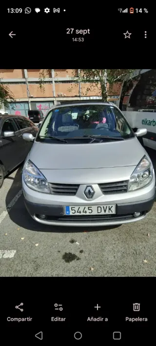 Renault Scenic 1.5dci 100cv 2004 Vehículo en buen estado para sus años y kilometros *Se vende en este precio por que marca fallo de inyección ( el vehiculo funciona bien) y ahi que pasarla ITV por lo demás el vehiculo esta perfecto y al dia de sus mantenimientos con algunos defectos leves de carrocería por el paso de los años y uso -Kilómetros Certificados -Impuesto 2026 pagado -2 llaves con mando -Libros Originales -Aceite y filtros recién cambiados -Kit de distribución a los 90.000km en 2023 -Correa Auxiliar cambiada en 2023 -Turbo nuevo en 2025 Se vende por disponer de mas vehículos y apenas usarse