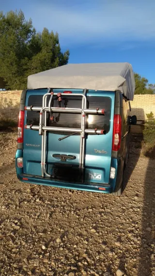 Renault Trafic Generación 2010. 129.000 kilómetros. Diesel. Automática. 115 caballos. 6 velocidades. Camper con cama techo elevable. Sillones traseros convertibles en cama. Asientos giratorios, mesa interior. Calefacción estacionaria Webasto.Fundas térmicas, interior y exterior Thais. 4 cubiertas nuevas. Cristales tintados. Porta bicis Fiama para dos bicis.Oscurecedores. 2 baterias. Todas las revisiones al día en casa oficial Renault.