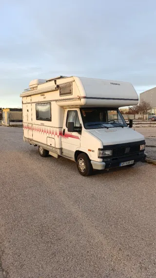 Fiat Ducato de 1992 fabricada por Frankia Motor 2.5 75 CV ITV en vigor hasta abril de este año 4 plazas para viajar y 4 plazas para dormir Bonita distribución francesa con gran sofá que permite montar una cama muy grande Extras Calefacción truma con circuito de ventilación Boiler Baúl de techo Porta bicis Segunda batería Pequeña placa solar Asientos conductor y copiloto cambiados a unos más cómodos Cualquier duda preguntar