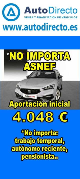 ¿No consigues financiación? ¡Tenemos la solución! RENT CREDIT (Alquiler con opción a compra) *************************************************************************** ✅ Aprobamos más del 95% de las operaciones. ✅ No importa ASNEF o RAI, impagos pendientes, ser autónomo o empresa reciente, ser pensionista. \\n ✅ Imprescindible aportación inicial del 20%. ✅ Ejemplo de operación: SEAT LEON 1.5 ETSI 150CV FR SPECIAL EDITION DSG. Ref. W955017MMT - Precio vehículo: 22790 €. - Aportación inicial de 4558 €. - Cuota mes desde 474 €. ✅ Impuesto de circulación y garantía de 1 año incluidos. *************************************************************************** ✅ Más de 3.000 VEHÍCULOS EN STOCK. ✅ Kilómetros certificados. ✅ 17 concesionarios repartidos en toda España. ♻️ Aceptamos tu coche como parte de la operación. *************************************************************************** IMPORTANTE: -. Este anuncio, no es vinculante, puede contener errores. SE MUESTRAN A TÍTULO INFORMATIVO Y NO CONTRACTUAL. -. Consultar disponibilidad del vehículo y datos exactos: fecha de matriculación, importes, etc,... *************************************************************************** Te ofrecemos distintas opciones: Venta al contado, financiación, renting, RENT CREDIT (Alquiler con opción a compra).