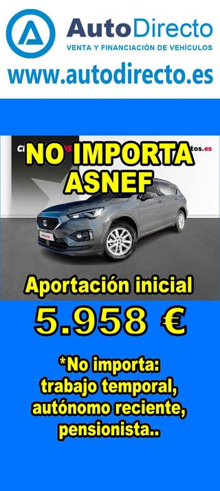 ¿No consigues financiación? ¡Tenemos la solución! RENT CREDIT (Alquiler con opción a compra) *************************************************************************** ✅ Aprobamos más del 95% de las operaciones. ✅ No importa ASNEF o RAI, impagos pendientes, ser autónomo o empresa reciente, ser pensionista. \\n ✅ Imprescindible aportación inicial del 20%. ✅ Ejemplo de operación: SEAT TARRACO 2.0 TDI 150CV STYLE XL DSG 7PLAZAS. Ref. W950029MHK - Precio vehículo: 29790 €. - Aportación inicial de 5958 €. - Cuota mes desde 617 €. ✅ Impuesto de circulación y garantía de 1 año incluidos. *************************************************************************** ✅ Más de 3.000 VEHÍCULOS EN STOCK. ✅ Kilómetros certificados. ✅ 17 concesionarios repartidos en toda España. ♻️ Aceptamos tu coche como parte de la operación. *************************************************************************** IMPORTANTE: -. Este anuncio, no es vinculante, puede contener errores. SE MUESTRAN A TÍTULO INFORMATIVO Y NO CONTRACTUAL. -. Consultar disponibilidad del vehículo y datos exactos: fecha de matriculación, importes, etc,... *************************************************************************** Te ofrecemos distintas opciones: Venta al contado, financiación, renting, RENT CREDIT (Alquiler con opción a compra).