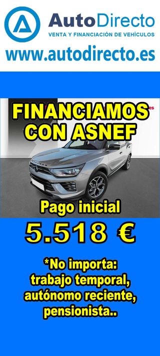 ¿No consigues financiación? ¡Tenemos la solución! RENT CREDIT (Alquiler con opción a compra) *************************************************************************** Aprobamos más del 90% de las operaciones. No importa ASNEF o RAI, impagos pendientes, ser autónomo o empresa reciente, ser pensionista. Imprescindible aportación inicial del 20%. Ejemplo de operación: SSANGYONG KORANDO 1.5 G15T 150CV GSR URBAN PLUS BITONO. Ref. W957778MZW - Precio vehículo: 27590 €. - Aportación inicial de 5518 €. - Cuota mes desde 572 €. - Impuesto de circulación y garantía de 1 año incluidos. *************************************************************************** ✅ Más de 3.000 VEHÍCULOS EN STOCK. ✅ Kilómetros certificados. ✅ 17 concesionarios repartidos en toda España. ♻️ Aceptamos tu coche como parte de la operación. *************************************************************************** IMPORTANTE: -. Este anuncio, no es vinculante, puede contener errores. SE MUESTRAN A TÍTULO INFORMATIVO Y NO CONTRACTUAL. -. Consultar disponibilidad del vehículo y datos exactos: fecha de matriculación, importes, etc,... *************************************************************************** Te ofrecemos distintas opciones: Venta al contado, financiación, renting, RENT CREDIT (Alquiler con opción a compra).
