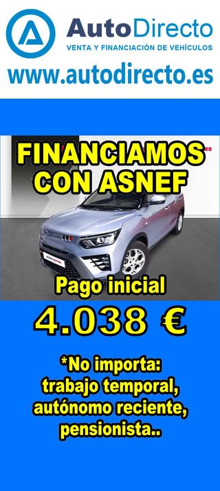 ¿No consigues financiación? ¡Tenemos la solución! RENT CREDIT (Alquiler con opción a compra) *************************************************************************** Aprobamos más del 90% de las operaciones. No importa ASNEF o RAI, impagos pendientes, ser autónomo o empresa reciente, ser pensionista. Imprescindible aportación inicial del 20%. Ejemplo de operación: SSANGYONG TIVOLI 1.5 G15T 160CV URBAN PLUS AUT. Ref. W957793MZW - Precio vehículo: 20190 €. - Aportación inicial de 4038 €. - Cuota mes desde 421 €. - Impuesto de circulación y garantía de 1 año incluidos. *************************************************************************** ✅ Más de 3.000 VEHÍCULOS EN STOCK. ✅ Kilómetros certificados. ✅ 17 concesionarios repartidos en toda España. ♻️ Aceptamos tu coche como parte de la operación. *************************************************************************** IMPORTANTE: -. Este anuncio, no es vinculante, puede contener errores. SE MUESTRAN A TÍTULO INFORMATIVO Y NO CONTRACTUAL. -. Consultar disponibilidad del vehículo y datos exactos: fecha de matriculación, importes, etc,... *************************************************************************** Te ofrecemos distintas opciones: Venta al contado, financiación, renting, RENT CREDIT (Alquiler con opción a compra).