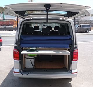 Furgoneta WOLVAGHEN CARAVELLE SEMINUEVA (Junio 2023) CAMPERIZADA por TINKERVAN con TECHO ELEVABLE. Consta de, una primera cama, de 2 m. largo X 1,50 m. ancho. La segunda cama arriba en techo elevable soporta un peso de hasta 100 kg. Abajo plataforma desplazable para cajas y maletas y otros enseres, con MUEBLE de COCINA de camping gas y FREGADERO con depósitos de aguas limpias y de aguas grises. FRIGORÍFICO ELÉCTRICO con capacidad de 45 kg. DUCHA portátil exterior con bomba. Cristales ahumados, con mosquiteras y con cortinas interiores, focos y luces laterales. Sillones delanteros giratorios hacia atras para crear un espacio con mesa y sillones para comer u otras actividades. Dos baterías, una la del coche y otra para luces, calefacción estacionaria...