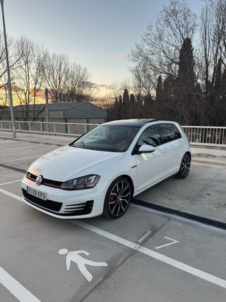 Volkswagen Golf 7 GTI Performance de finales del año 2014, importado en el año 2018 por el concesionario Autobahn Madrid. Coche muy cuidado como se observa en las fotos. Se acaba de pintar por completo para su venta, no tiene ningun desperfecto. Tiene hechos todos sus mantenimientos entre los cuales se encuentran dos cambios de aceite del cambio DSG (son cada 60mil y uno se hizo antes de importar y esta sellado en su libro con 50mil y el otro a los 105mil). El coche cuenta con varios extras de casa como cambio DSG, llantas Santiago 19”, techo solar, Keyless, asientos calefactables, espejos electricos y calefactados...) y algún otro que le he añadido yo, como los pilotos traseros con intermitentes dinámicos, cámara de marcha atras integrada en el logo trasero, virtual cockpit, unidad infotainment MIB 2.5 con pantalla de 9,2” y control gestual del Golf 7.5 (restyling), todo completamente original e instalado en VagRetrofits, junto con clima táctil. También se le tapizó el volante y se cambiaron cinturones como el Golf GTI TCR y se pintaron todas las rejillas delanteras y taloneras en negro brillo. Las 4 llantas están impolutas, y los neumaticos son dos Michelin Pilot Sport 4 y dos Pirelli PZero al 70% de vida. Los discos traseros tambien son nuevos y los delanteros tienen muy poco desgaste.