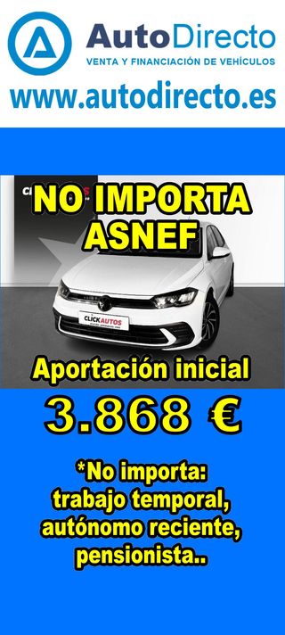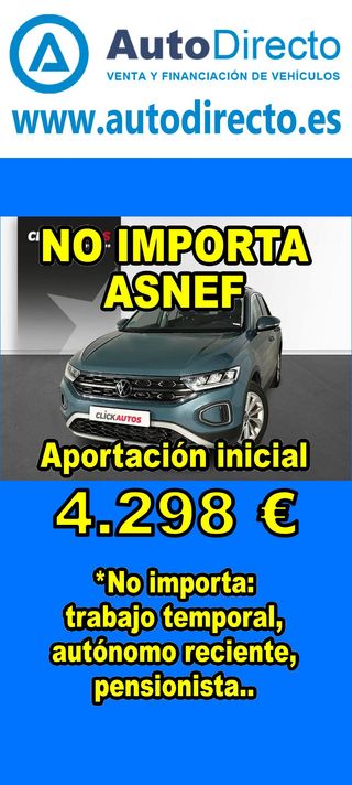 ¿No consigues financiación? ¡Tenemos la solución! RENT CREDIT (Alquiler con opción a compra) *************************************************************************** ✅ Aprobamos más del 95% de las operaciones. ✅ No importa ASNEF o RAI, impagos pendientes, ser autónomo o empresa reciente, ser pensionista. ✅ Imprescindible aportación inicial del 20%. ✅ Ejemplo de operación: VOLKSWAGEN T-CROSS 1.0 TSI 110CV ADVANCE. Ref. W951594MFS - Precio vehículo: 20090 €. - Aportación inicial de 4018 €. - Cuota mes desde 419 €. ✅ Impuesto de circulación y garantía de 1 año incluidos. *************************************************************************** ✅ Más de 3.000 VEHÍCULOS EN STOCK. ✅ Kilómetros certificados. ✅ 17 concesionarios repartidos en toda España. ♻️ Aceptamos tu coche como parte de la operación. *************************************************************************** IMPORTANTE: -. Este anuncio, no es vinculante, puede contener errores. SE MUESTRAN A TÍTULO INFORMATIVO Y NO CONTRACTUAL. -. Consultar disponibilidad del vehículo y datos exactos: fecha de matriculación, importes, etc,... *************************************************************************** Te ofrecemos distintas opciones: Venta al contado, financiación, renting, RENT CREDIT (Alquiler con opción a compra).