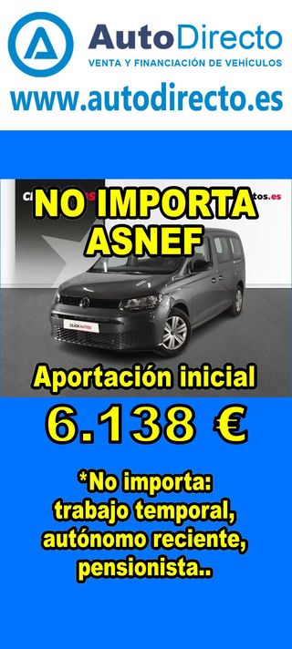 ¿No consigues financiación? ¡Tenemos la solución! RENT CREDIT (Alquiler con opción a compra) *************************************************************************** ✅ Aprobamos más del 95% de las operaciones. ✅ No importa ASNEF o RAI, impagos pendientes, ser autónomo o empresa reciente, ser pensionista. \\n ✅ Imprescindible aportación inicial del 20%. ✅ Ejemplo de operación: VOLKSWAGEN CADDY MAXI 2.0 TDI 102CV ORIGIN 5+2. Ref. W956233MYN - Precio vehículo: 30640 €. - Aportación inicial de 6128 €. - Cuota mes desde 634 €. ✅ Impuesto de circulación y garantía de 1 año incluidos. *************************************************************************** ✅ Más de 3.000 VEHÍCULOS EN STOCK. ✅ Kilómetros certificados. ✅ 17 concesionarios repartidos en toda España. ♻️ Aceptamos tu coche como parte de la operación. *************************************************************************** IMPORTANTE: -. Este anuncio, no es vinculante, puede contener errores. SE MUESTRAN A TÍTULO INFORMATIVO Y NO CONTRACTUAL. -. Consultar disponibilidad del vehículo y datos exactos: fecha de matriculación, importes, etc,... *************************************************************************** Te ofrecemos distintas opciones: Venta al contado, financiación, renting, RENT CREDIT (Alquiler con opción a compra).