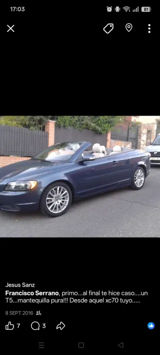 Vendo Volvo C70 2.4T cabrio año 2003, motor 5 cilindros 2.5 turbo de 200 CV, pegatina B, ITV válida hasta noviembre 2026. El motor va muy fino, tiene mucha fuerza. El cambio automático se le hizo mantenimiento hace menos de 20000 Km. Lleva llantas originales de Volvo Tritón de 18", con neumáticos en buen estado, más del 50% de vida útil todavía. Estas llantas son muy difíciles de encontrar. Cosas que tiene: - Los asientos de cuero están cuarteados, no rotos, habría que darles mimo. - De pintura tampoco está bien, duerme en la calle y tiene los clásicos roces. - La capota abre y cierra bien, pero la tela empieza a acusar los años y aunque no filtra, en unos años debería ser reemplazada. - La ventanilla del lado del acompañanante baja bien, pero le cuesta subir. - El parasol del acompañante habría que cambiarlo. - Tiene un pequeño consumo eléctrico aleatorio. No consigo dar con él. Si lo utilizas al menos una vez por semana ni te vas a dar cuenta. Da la cara cuando lo dejas más de un mes sin moverlo. El coche se encuentra en San Fernando de Henares (Madrid)