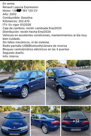 Renault Laguna II Versión: Expression Motor: 1.8 litros - 16V - 120 CV Año: 2002 Combustible: Gasolina Kilómetros: 202.484 ITV: En vigor 01/2026 Caja de cambios: recién cambiada Ene/2025 Distribución: recién hecha Ene/2024 Vehículo en excelentes condiciones, mantenimientos al dia muy bien cuidado. Sin fallos mecánicos, ni de sistema. Radio pantalla USB/Bluetooth/cámara de reversa Bloqueo central/eleva lunas eléctrico en las 4 puertas Aire acondicionado bizona. Segundo dueño. Info: 672896082 / 623122760