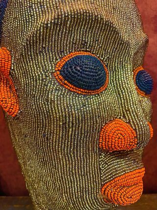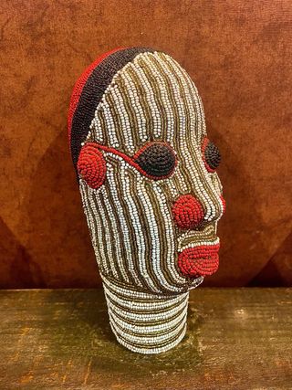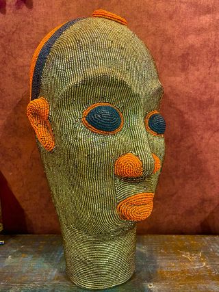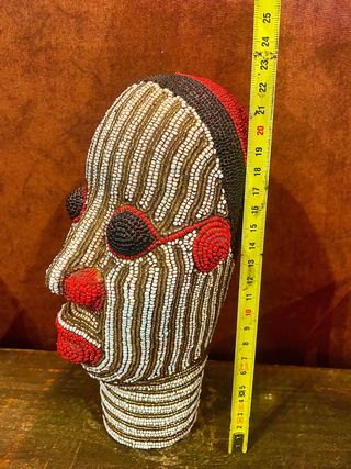 Cabeza decorativa Bamileke. Base hecha en barro y decoradas con cuentas de cristal. Pesada y robusta. Original de Camerún, comprada por mi misma en un viaje. Tamaño grande, similar al tamaño de una cabeza humana. Muy impresionante.