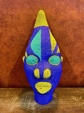 Auténtica cabeza decorativa de la tribu Bamileke de Camerún. Una pieza única con un diseño llamativo. - Elaborada con cuentas de colores vibrantes. - Tonos azules, amarillos y verdes predominantes. - Representación tribal africana. Traida directamente de Africa durante un viaje. Unico, artesano, especial, artesania, original, decoración, etnica, africa
