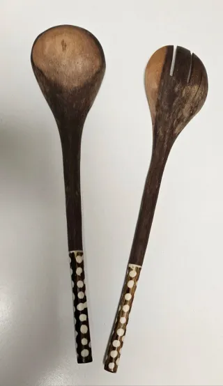 Set de dos servidores de ensalada de madera y hueso. - Diseño rústico con detalles en blanco. - Uno de los servidores tiene ranuras.