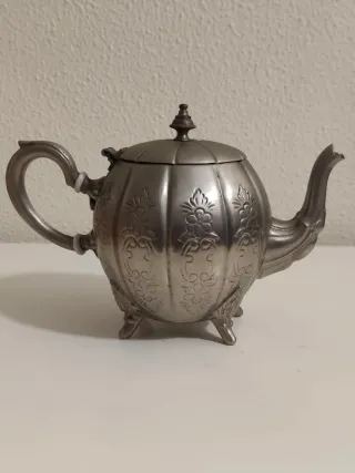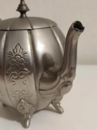 Elegante tetera antigua con un diseño inspirado en el estilo marroquí. Su forma redondeada como un acalabaza y los detalles ornamentales le otorgan un carácter único. - Material metálico con acabado plateado. - Decoración floral en relieve. - Base con cuatro patas. - Tapa con pomo.