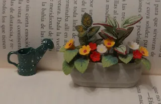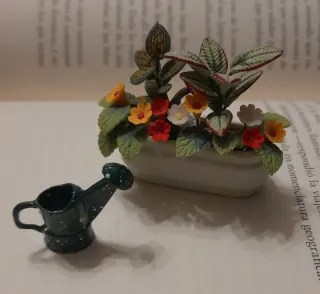 Conjunto de miniaturas para casa de muñecas, ideal para dar un toque de realismo a tus escenas. - Maceta con flores variadas en tonos rojos, amarillos y blancos. - Pequeña regadera verde con detalles blancos.