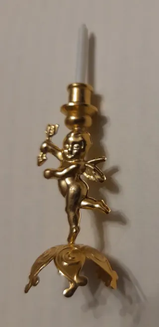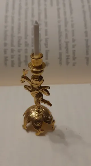 Este es un delicado candelabro en miniatura con un diseño de ángel. - Material: Metal dorado. - Diseño: Figura de ángel con base ornamentada. - Incluye una vela blanca pequeña.