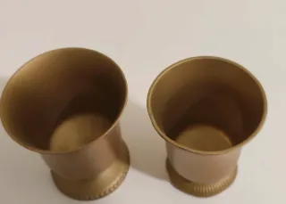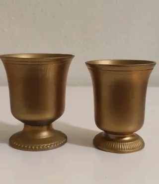 Conjunto de dos vasos de peltre con un diseño elegante. - Acabado en color dorado. - Base con detalles decorativos. Tienen sellos en la base donde figura la autenticidad e indican su calidad El precio es por los dos
