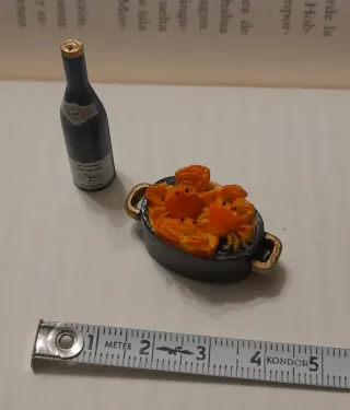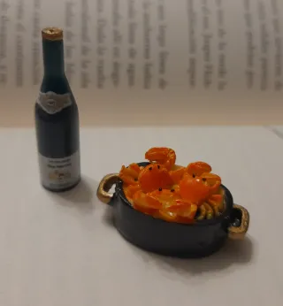 Set de miniaturas para casa de muñecas. - Botella de vino con etiqueta. - Cazuela con cangrejos.