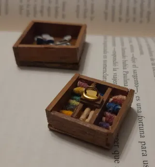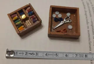 Conjunto de miniaturas para casa de muñecas, ideal para coleccionistas o para añadir detalles a tus dioramas. - Caja de madera con compartimentos. - Contiene hilos de colores, tijeras, botones, ...