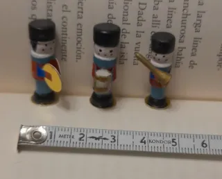 Conjunto de tres miniaturas de soldados de plomo, cada uno con un diseño único. - Soldado con tambor. - Soldado con trompeta. - Soldado con platillos.