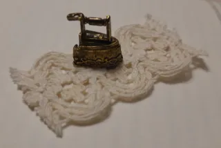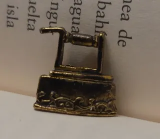 Detalle de miniatura de mini, mini plancha antigua, ideal para casas de muñecas o coleccionismo. - Diseño metálico con detalles ornamentales. - Acabado en tono bronce.