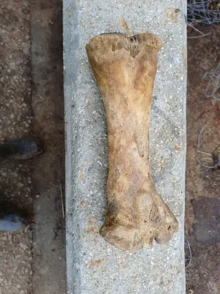 Hueso de animal, ideal para coleccionistas o como elemento decorativo. - Material: Hueso natural. - Color: Tono hueso con vetas marrones y verdosas. - Textura: Superficie rugosa y con marcas naturales.
