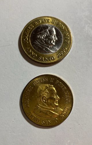 Dos monedas conmemorativas del Vaticano del año 2000, con la efigie de Juan Pablo II. - Anverso: Retrato de Juan Pablo II. - Reverso: Inscripción ANNO SANTO 2000 y JOANNES PAVLYS II PONT MAX.
