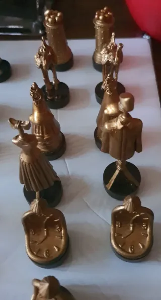 Conjunto de piezas de ajedrez inspiradas en el arte de Dalí. De madera, obsidiana mejicana tamaño muy grande, metal....Se vende la colección o sueltos. Si quieren más fotos pídelas. No subi el de obsidiana, ni uno chino . También tableros. - Piezas de metal con acabado dorado. - Diseño único y artístico.