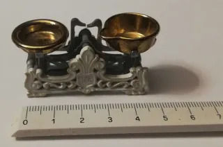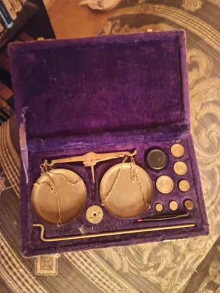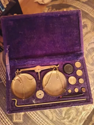 Báscula de precisión antigua, ideal para coleccionistas o para uso decorativo. Incluye su estuche original. - Báscula de latón con dos platillos. - Juego de pesas de diferentes tamaños. - Pinzas para manipular las pesas. - Estuche forrado en terciopelo morado.