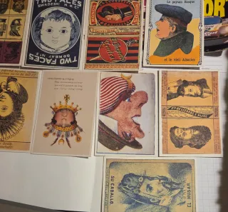 Conjunto de 20 postales vintage originales con diseños reversibles, estilo Tobacciana; caja de cerillas RedStone, primera edición 1998 (24 postales) - Ilustraciones de personajes y escenas. - Diseños que cambian al darles la vuelta. - Papel de calidad con impresión detallada.