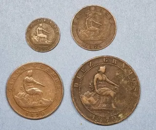 Conjunto de 4 monedas del Gobierno Provisional, acuñadas en 1870. - Diseño con figura sentada. - Inscripción CINCO GRAMOS en una moneda. - Inscripción DIEZ GRAMOS en otra moneda. - Inscripción DOS GRAMOS en una moneda. - Inscripción UN GRAMO en una moneda.