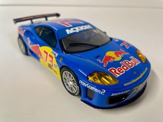 Coche de slot Ferrari 360 GTC de Scalextric con decoración Red Bull. - Réplica detallada del modelo de competición. - Diseño llamativo en azul con logos de Red Bull y número 73. - Escala 1:32.