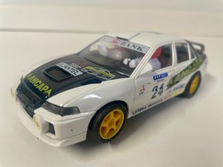 Coche de slot Scalextric, modelo Mitsubishi Lancer EVO IV con decoración Ancapa. - Réplica detallada del coche de rally. - Diseño deportivo en blanco y negro. - Llantas amarillas. - Número de dorsal 24.