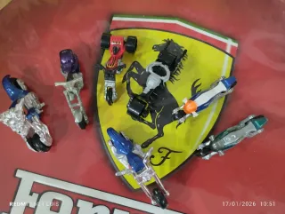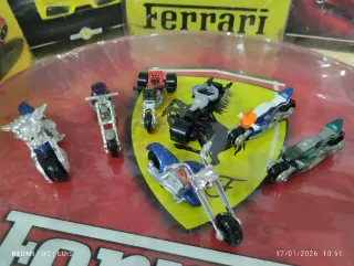 Conjunto de seis mini motos de colección. - Diseño deportivo y futurista. - Colores variados: azul, plateado, naranja y verde. - Detalles cromados y acabados brillantes. Sin blíster